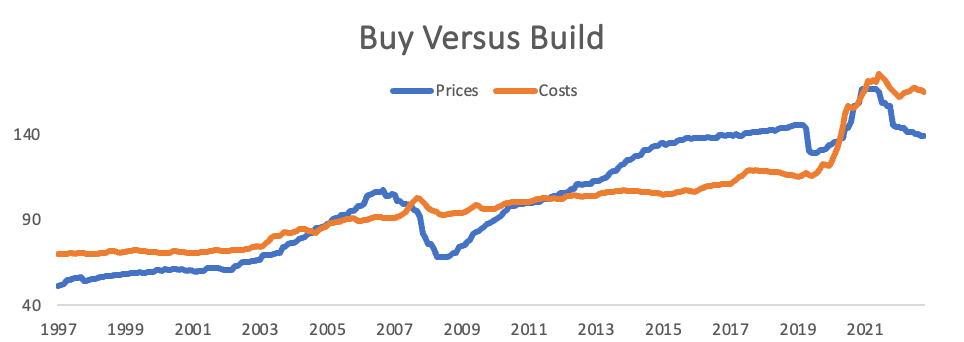 Things are different now. Higher interest rates have made it more expensive to undertake new projects, and lower property values make the economics unappealing. The below indices represent the costs of new construction compared to the values of existing properties. This proxy index shows that prices are currently 16% below construction costs, which is the greatest discount since a brief window in 2008-09, which turned out to be a great time to buy.