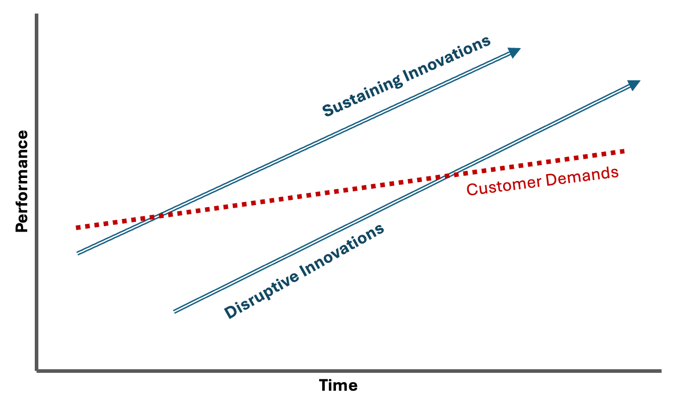One key insight of this model is that innovations often improve at a faster rate than the market demands. Established companies, through sustaining innovations, overshoot the market and provide more than the market needs.